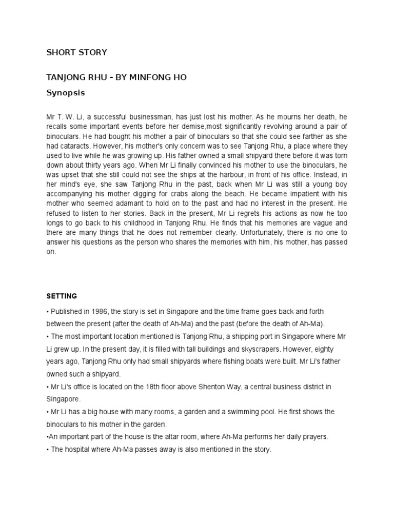 Short Story Docx Short Story Tanjong Rhu Synopsis Mr T W Li A Successful Businessman Has Just Lost His Mother As He Mourns Her Death He Recalls Course Hero